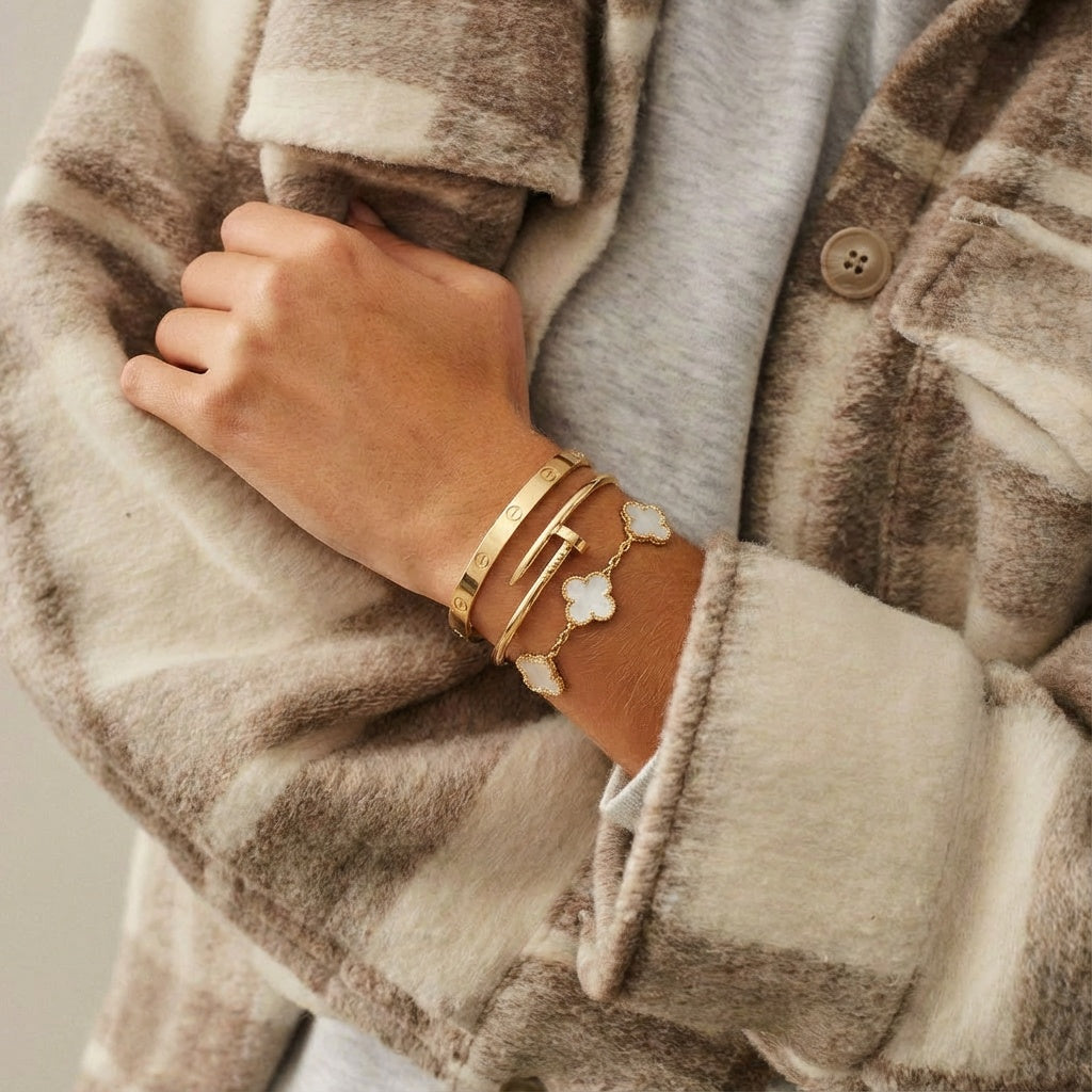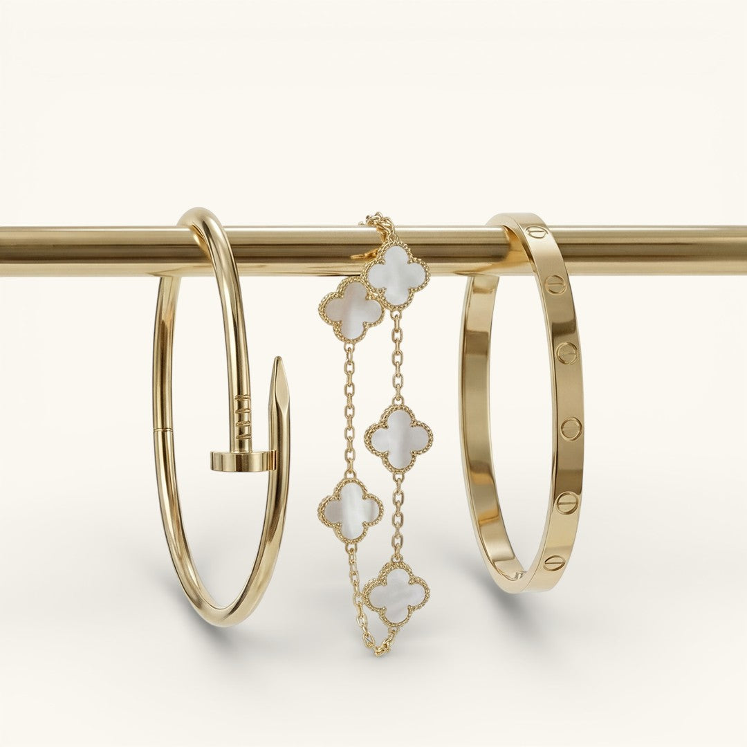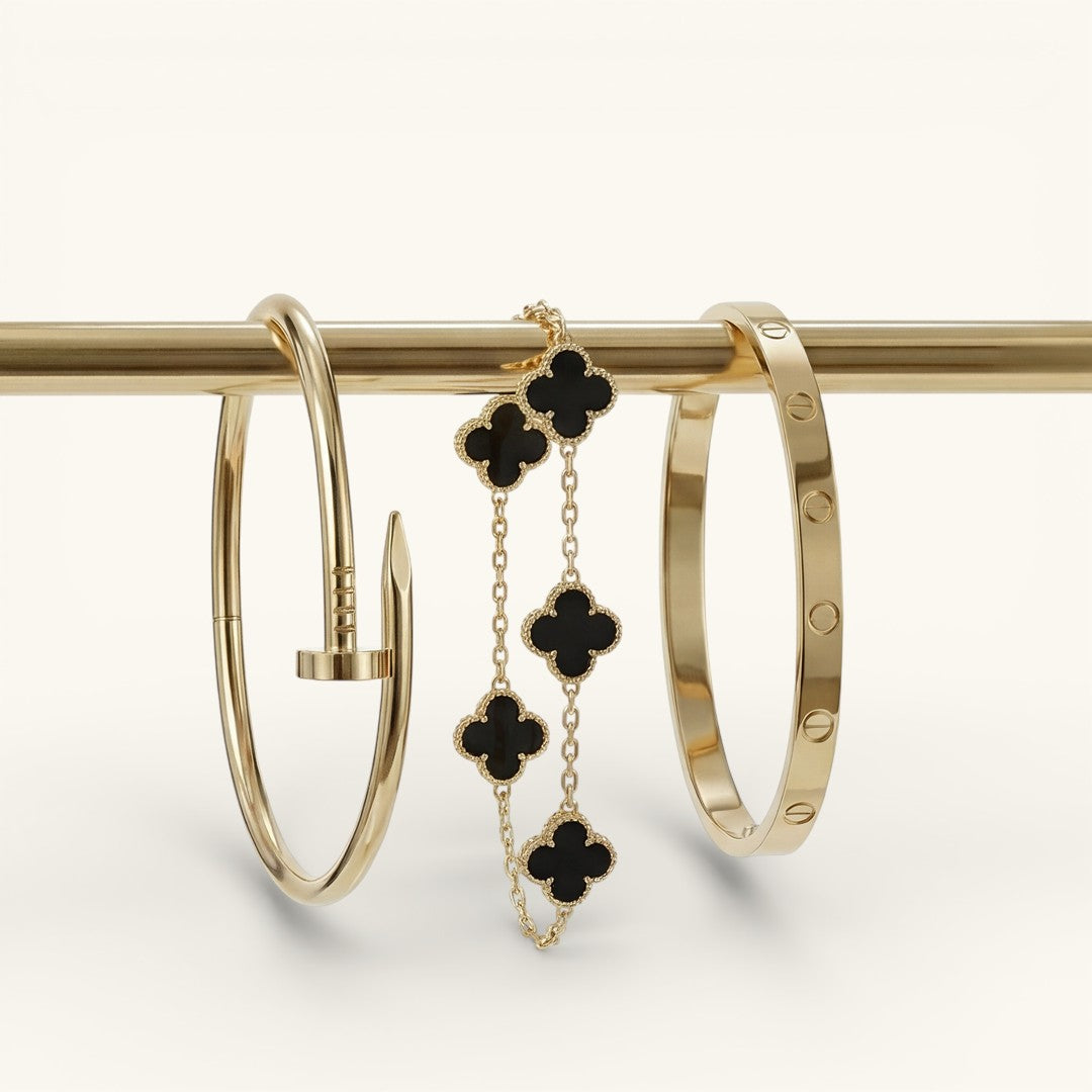 18k gold plating on surgical steel. Engineered to stay brilliant, always.
